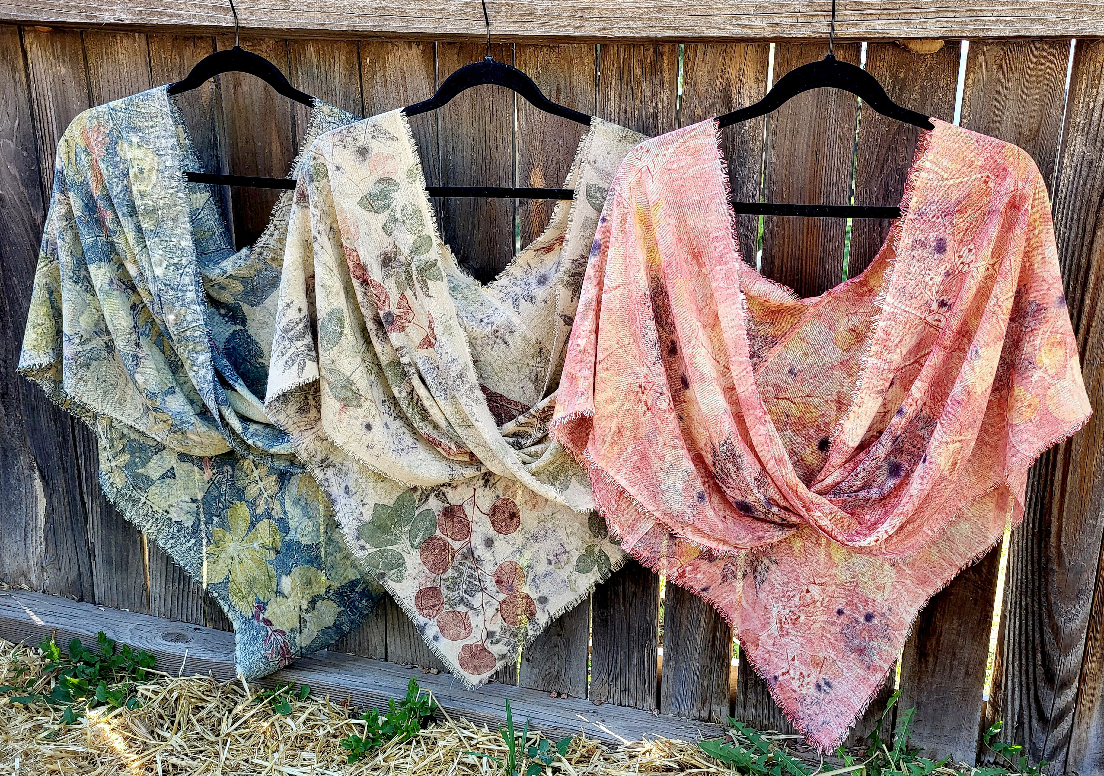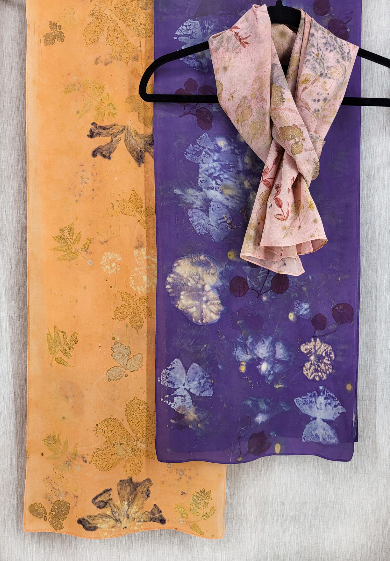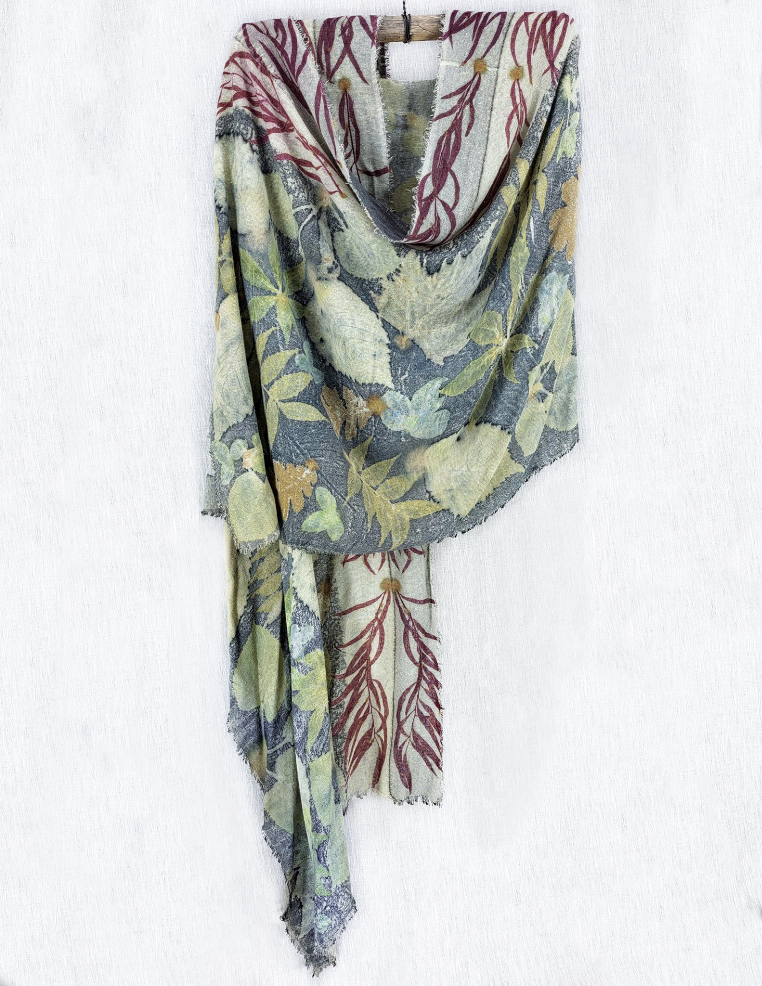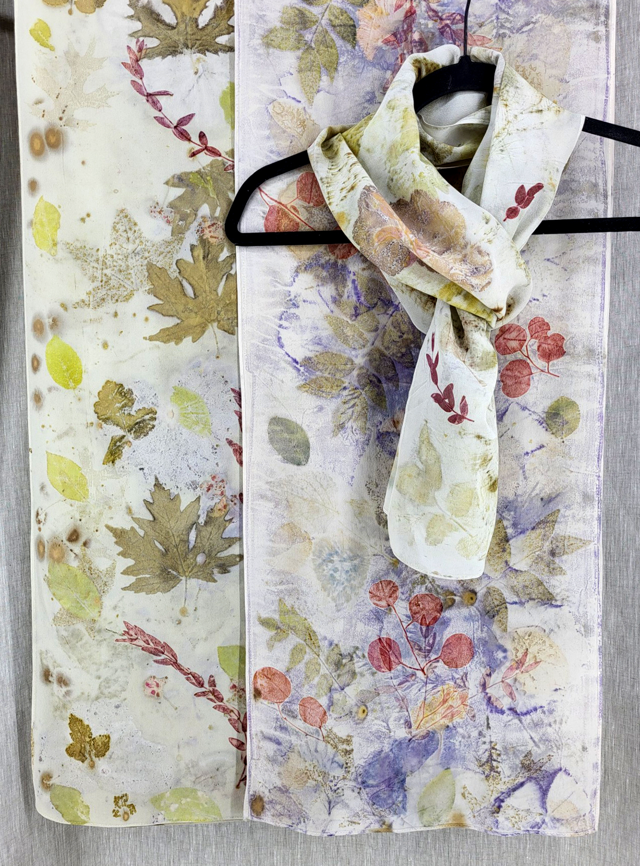 Scarves are printed with layers of leaves between them so that they are printed on both sides and prints are very layered creating the feeling of delicate forest floor.