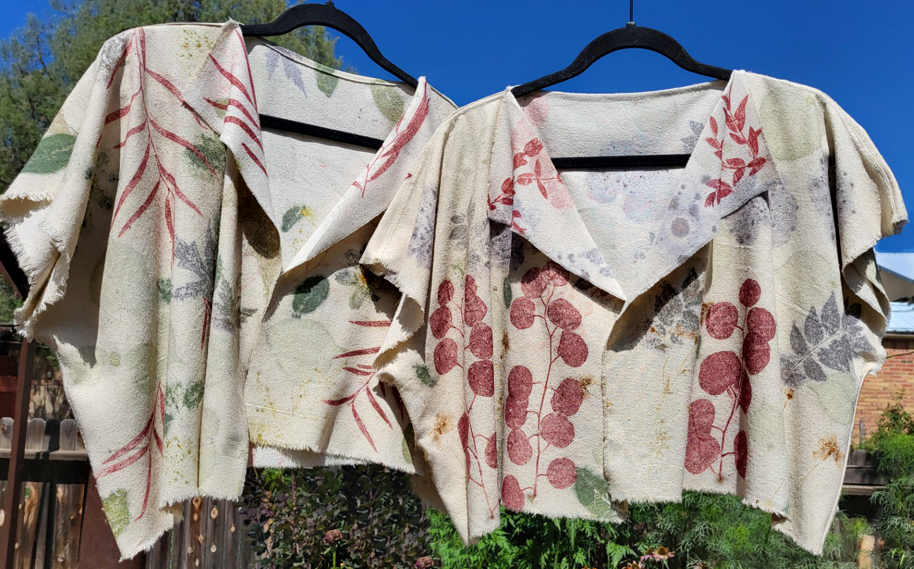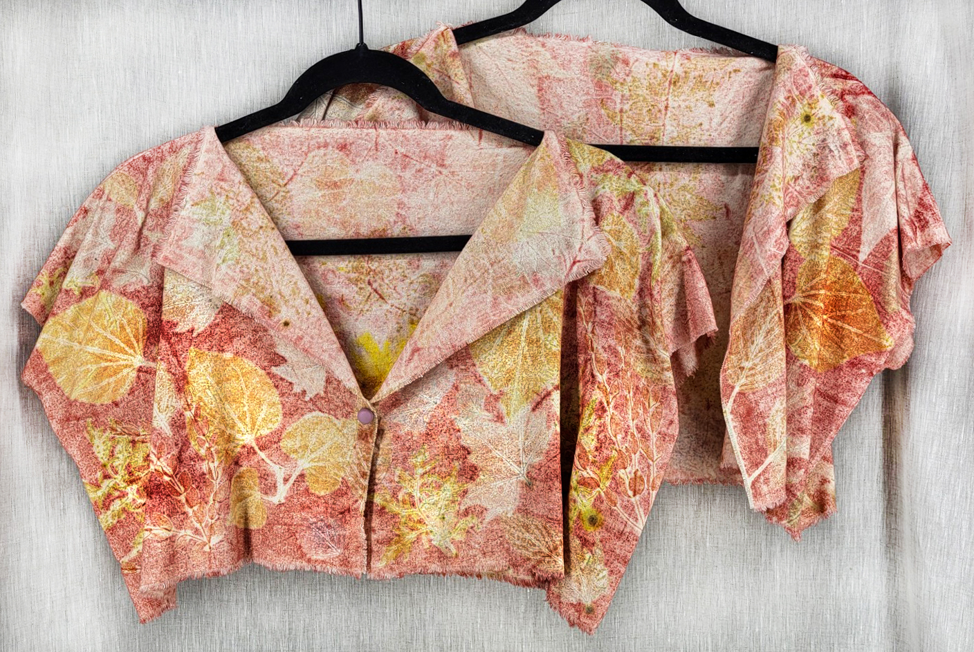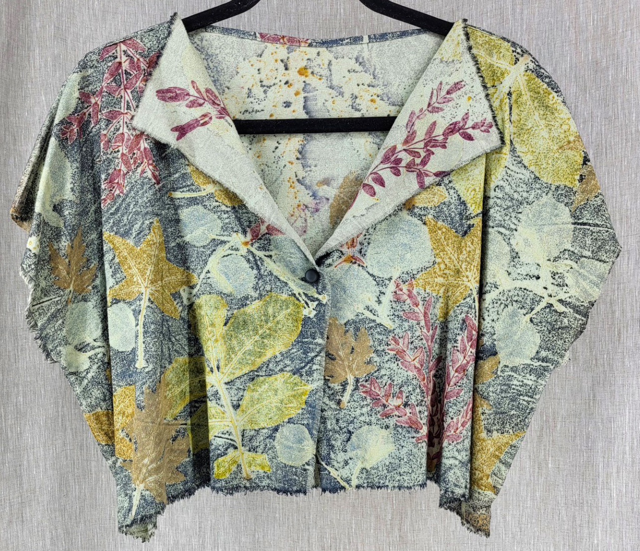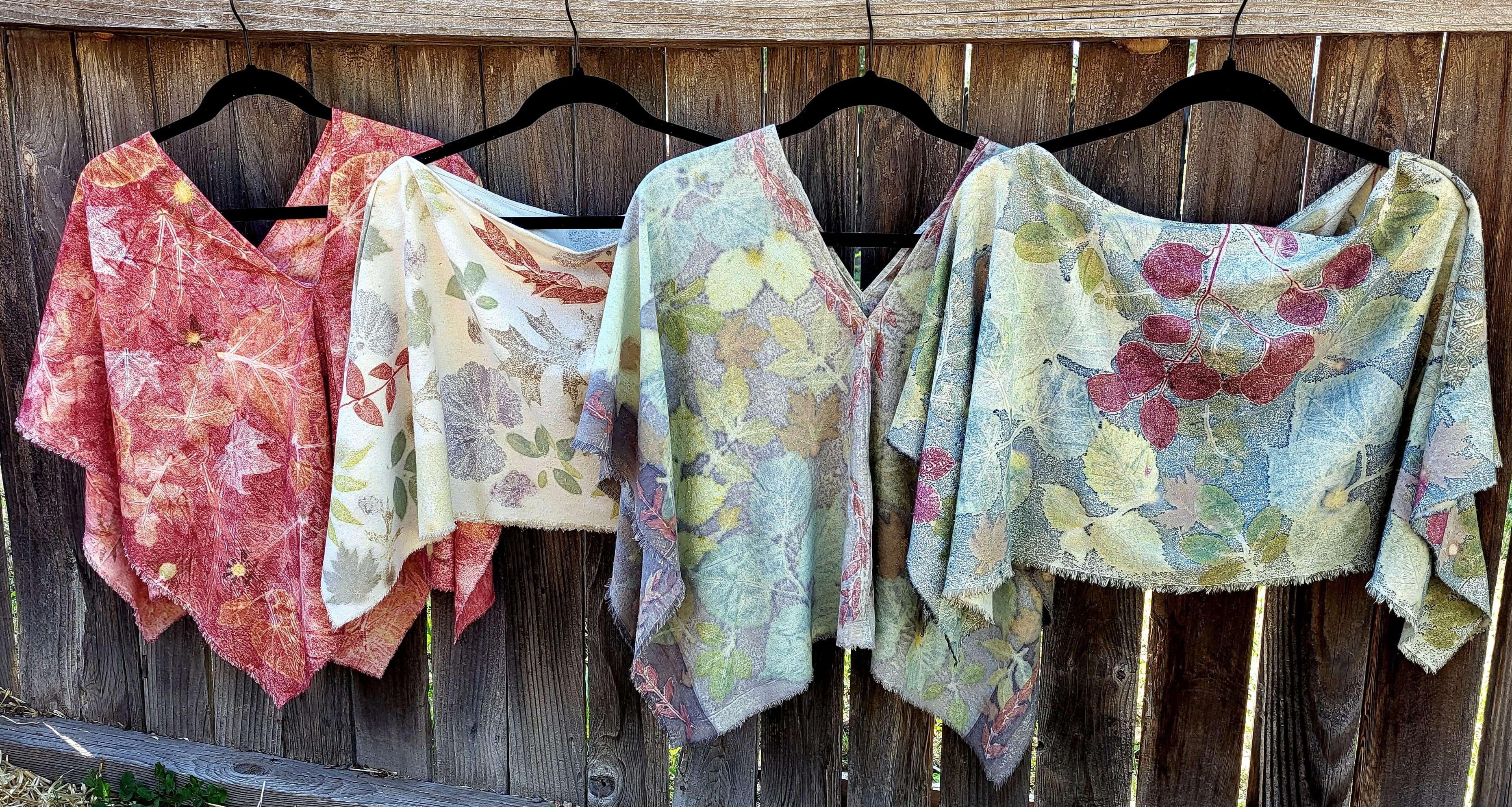 Scarves are printed with layers of leaves between them so that they are printed on both sides and prints are very layered creating the feeling of delicate forest floor.